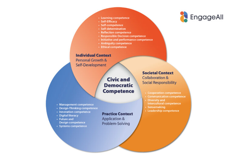 Grounded in rigorous research—including systematic literature review, cross-analysis of existing frameworks, and qualitative studies across multiple European contexts—EngageComp identifies 21 key competences organised within three interconnected domains: Individual Context (Personal Growth & Self-Development), Practice Context (Application & Problem-Solving), and Societal Context (Collaboration & Social Responsibility). These domains work together to build an overarching outcome: Civic and Democratic Competence, demonstrated across all areas of student engagement.
